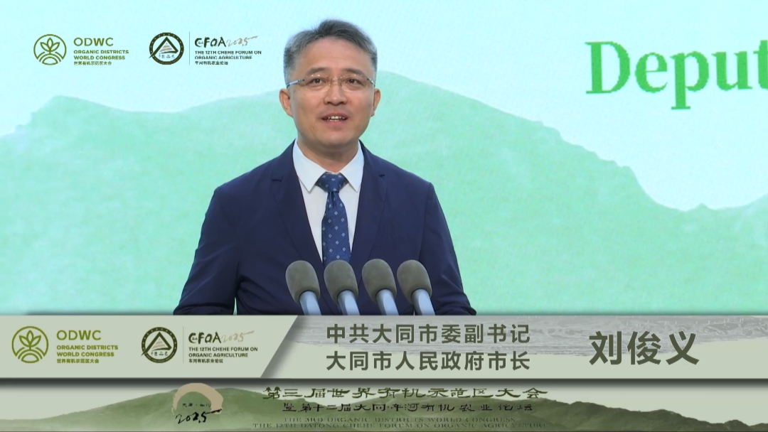 劉俊義在致辭中代表市委市政府向蒞臨本次論壇的各位嘉賓和朋友表示歡迎,向長期以來關(guān)心、支持大同農(nóng)業(yè)發(fā)展的社會(huì)各界表示感謝。他說,從2013年開始,靈丘縣深入踐行“兩山”理念,把生態(tài)優(yōu)勢、資源優(yōu)勢轉(zhuǎn)化為產(chǎn)業(yè)優(yōu)勢、經(jīng)濟(jì)優(yōu)勢,探索出一條晉北地區(qū)“特優(yōu)”農(nóng)業(yè)發(fā)展的全新之路。靈丘有機(jī)農(nóng)業(yè)是全市特優(yōu)農(nóng)業(yè)發(fā)展的一個(gè)縮影。近年來,我市深入學(xué)習(xí)貫徹習(xí)近平總書記考察山西重要講話重要指示精神,落實(shí)省委、省政府部署要求,聚力實(shí)施農(nóng)業(yè)“特”“優(yōu)”戰(zhàn)略,充分發(fā)揮農(nóng)牧交錯(cuò)帶示范區(qū)、有機(jī)旱作農(nóng)業(yè)示范區(qū)和北肉平臺(tái)優(yōu)勢,全力打造“6+2”產(chǎn)業(yè)體系,以有機(jī)農(nóng)業(yè)為引領(lǐng),全市現(xiàn)代農(nóng)業(yè)發(fā)展取得顯著成效。他表示,大同將以本次論壇為契機(jī),持續(xù)深化國際交流合作,推動(dòng)有機(jī)農(nóng)業(yè)發(fā)展不斷取得新進(jìn)展新成效。同時(shí)誠摯邀請各位嘉賓走進(jìn)大同,品味大同文化的厚度、體驗(yàn)大同發(fā)展的熱度、感受大同轉(zhuǎn)型的力度。