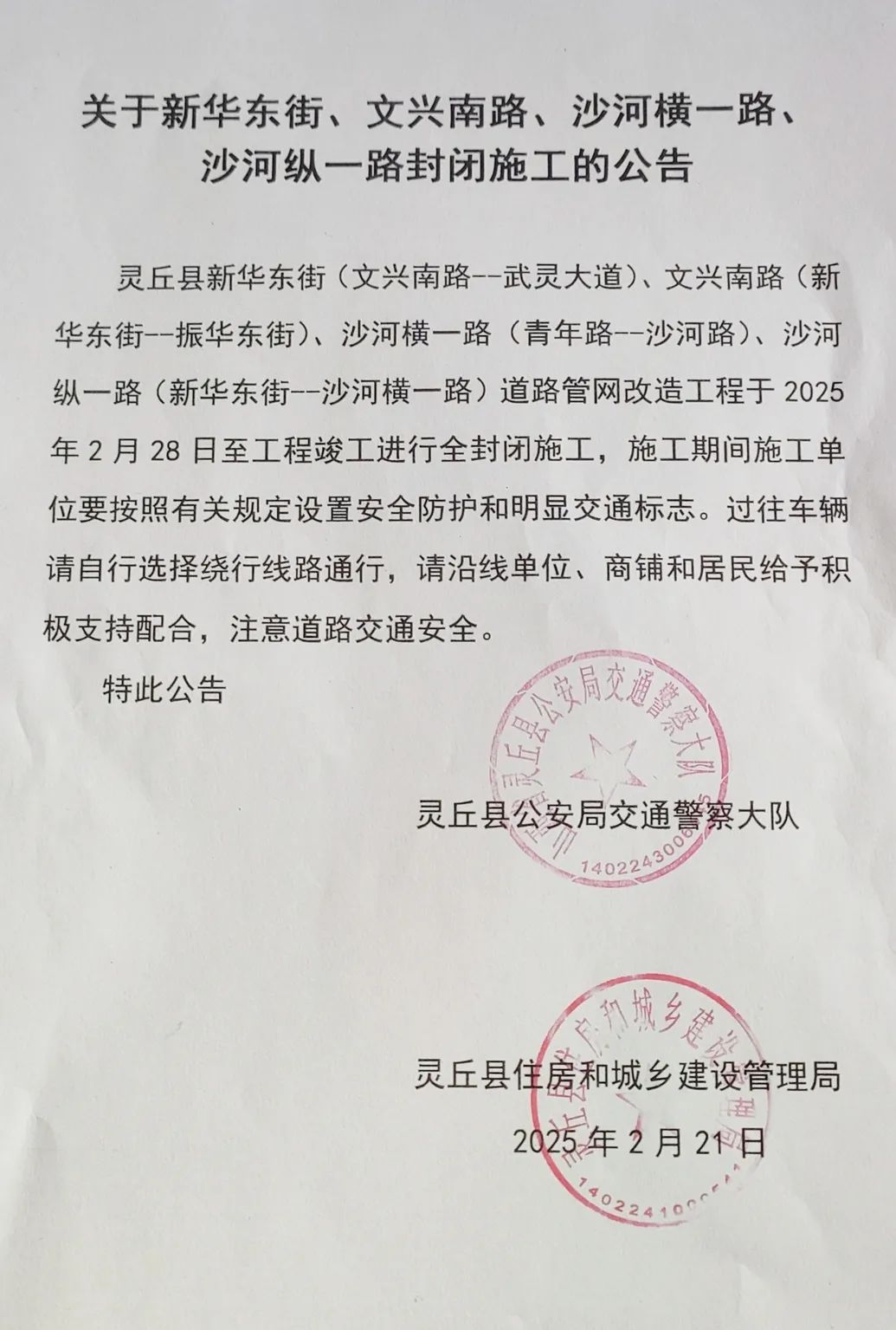 關(guān)于新華東街、文興南路、沙河橫一路、 沙河縱一路封閉施工的公告
